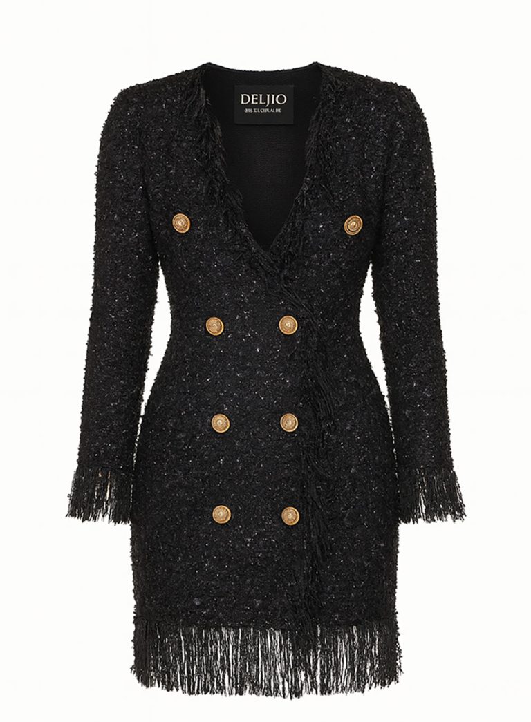 A striking tweed mini dress with a tailored double-breasted cut, accentuated by embossed gold buttons and playful fringe trim along the cuffs and hemline. Its rich texture and deep neckline balance sophistication with allure — ideal for evening occasions that call for statement elegance.