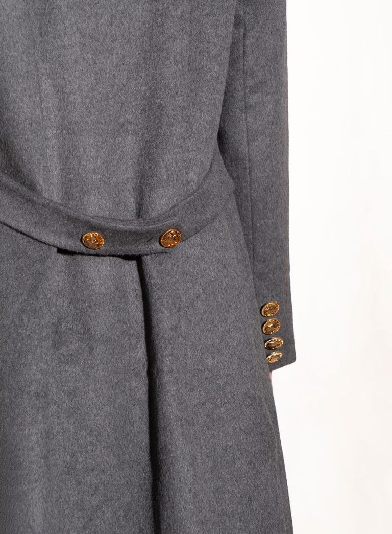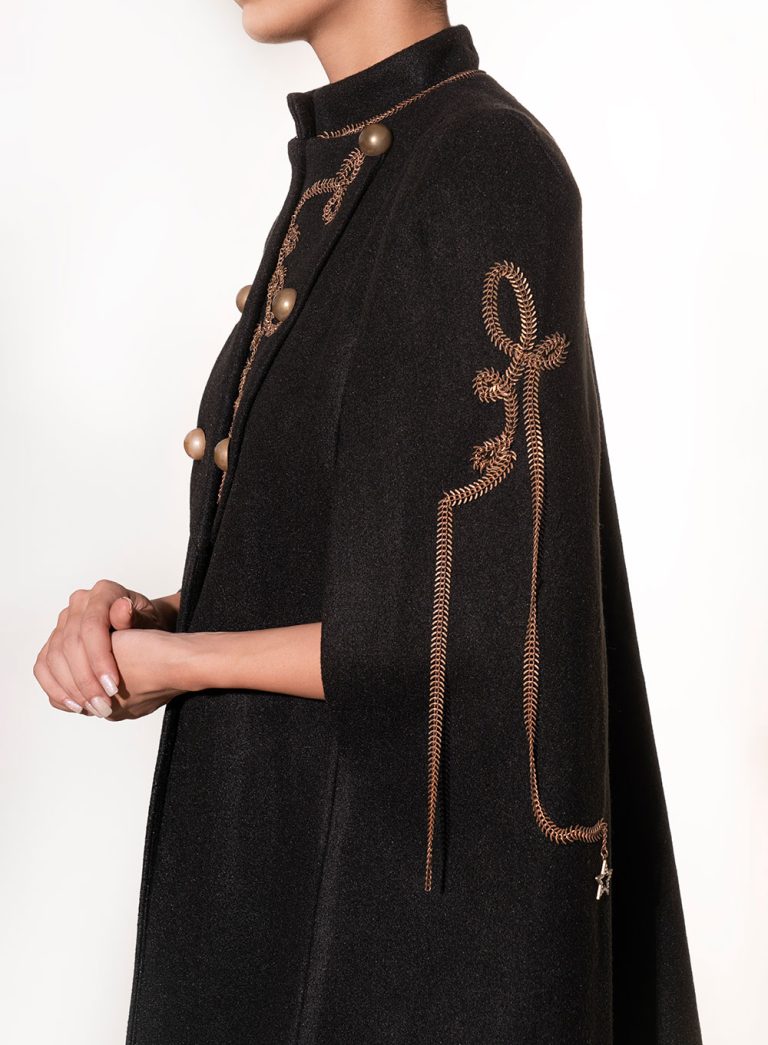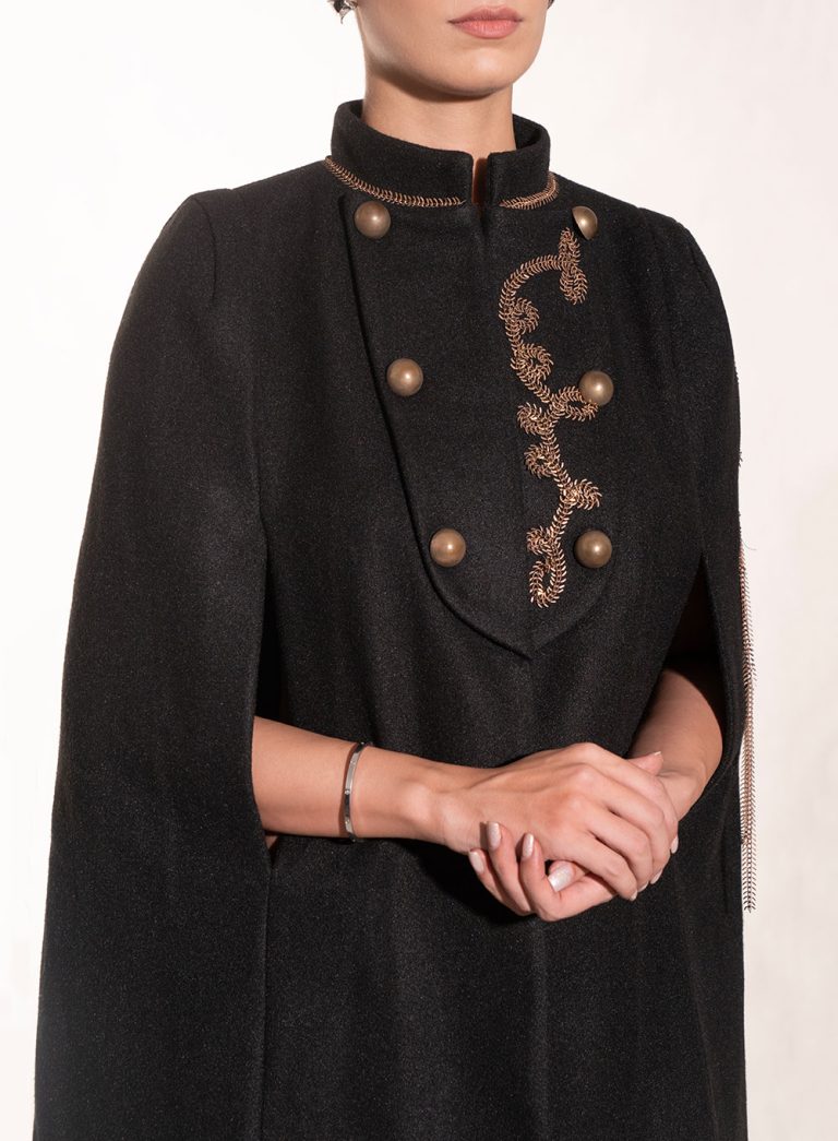 An elegant cape coat inspired by classic military tailoring, featuring intricate embroidery and statement metallic buttons. The structured neckline and open-arm design combine authority with feminine sophistication, creating a bold silhouette for refined evening or ceremonial wear.