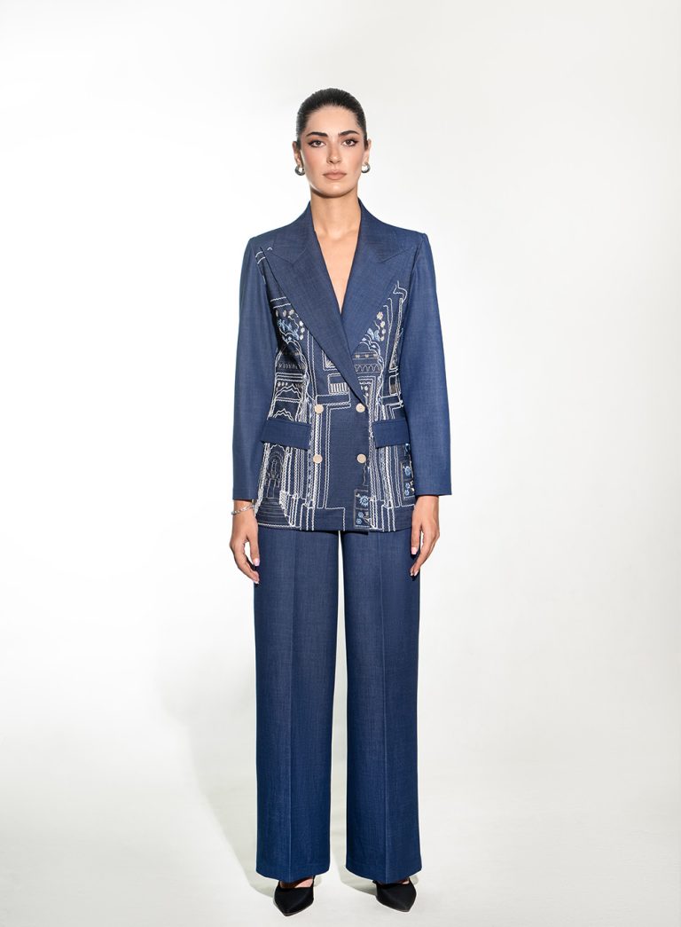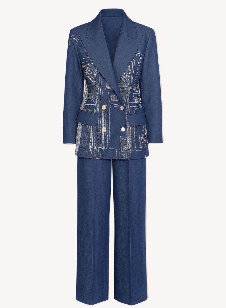 An exquisitely tailored blazer and wide-leg trouser set adorned with intricate architectural embroidery. The structured silhouette and sharp lapels evoke timeless sophistication, while the detailed stitching adds an artisanal edge — a refined fusion of craftsmanship and contemporary design.