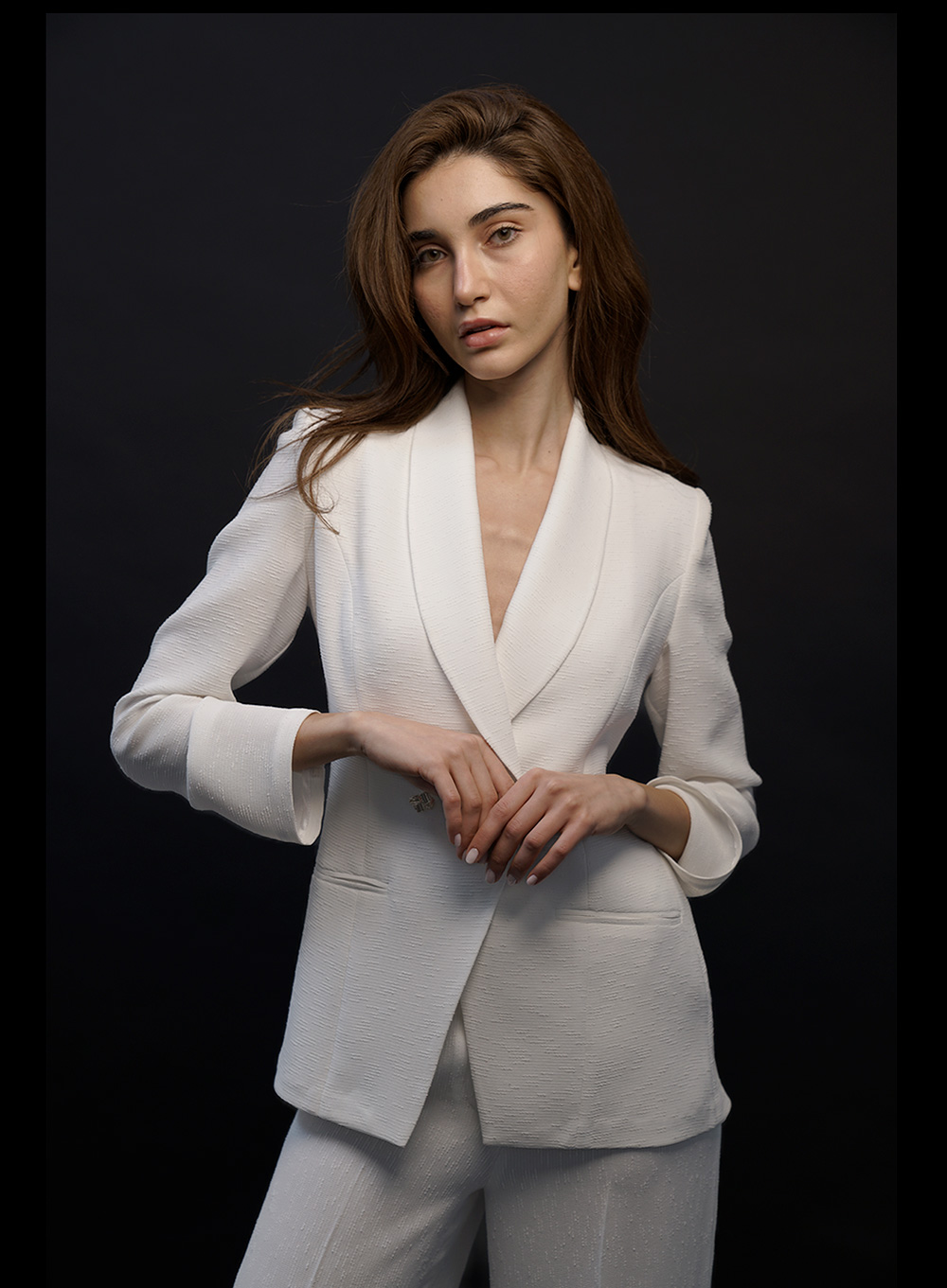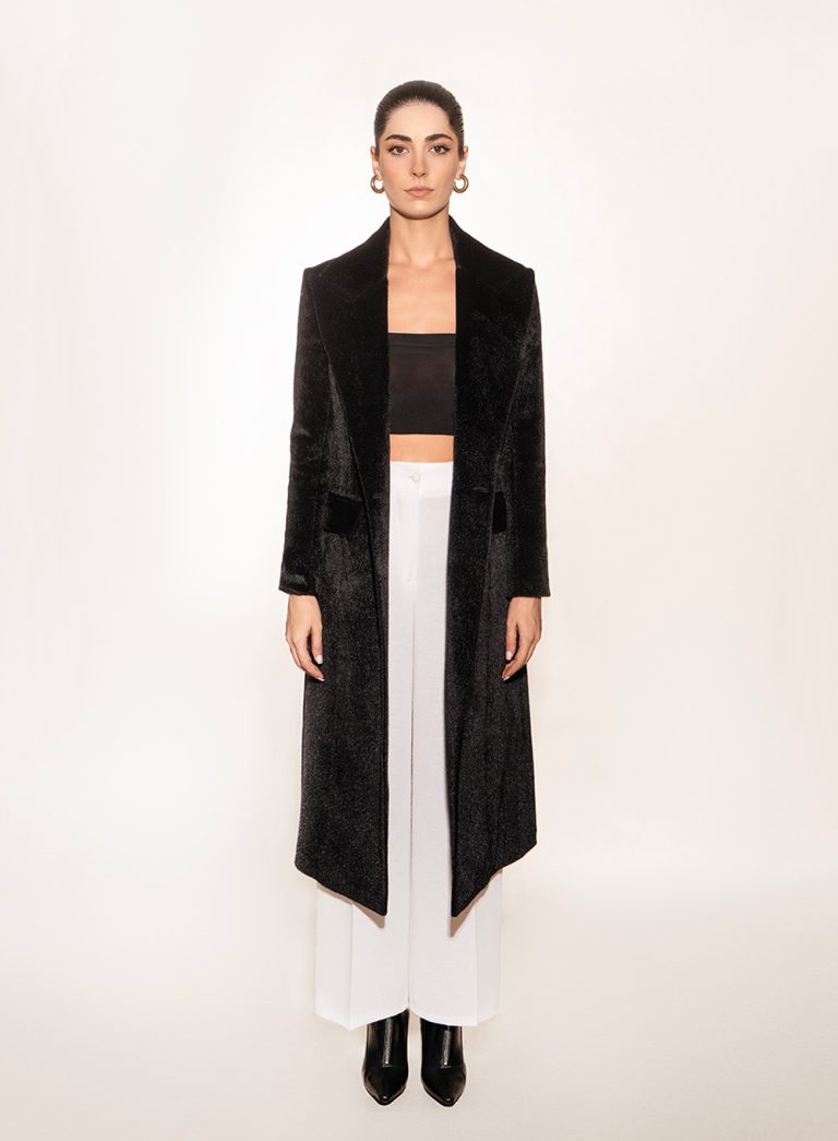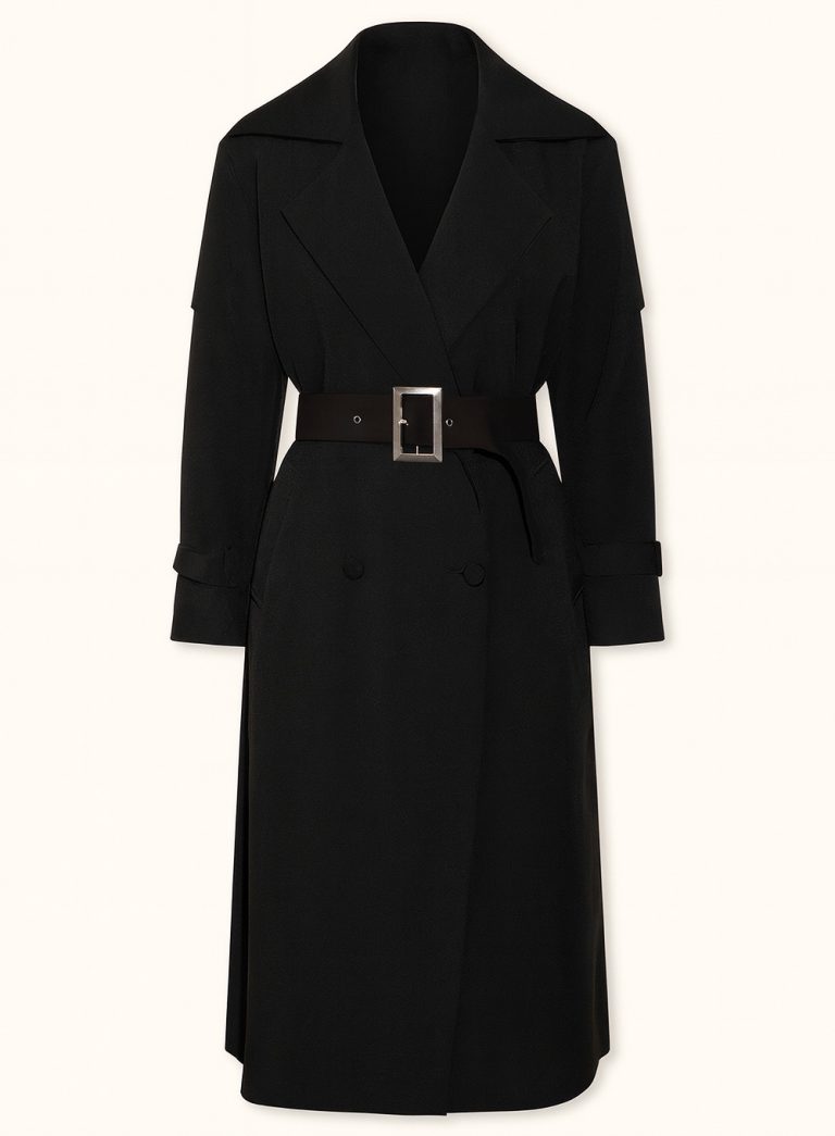 A modern reinterpretation of the classic trench coat, tailored with sharp lines and a fluid drape. The double-breasted front and extended length create a statement silhouette, balancing power and elegance. Designed to layer seamlessly over both minimal and tailored looks.