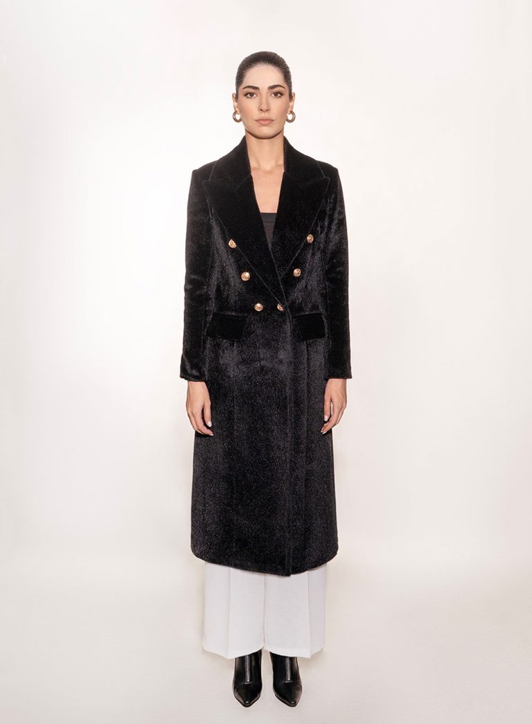 A refined long coat with a minimalist silhouette and structured shoulders, designed to enhance a clean, confident look. The sleek tailoring and double-button detail bring balance between classic sophistication and modern precision — ideal for transitional seasons and timeless wardrobes.