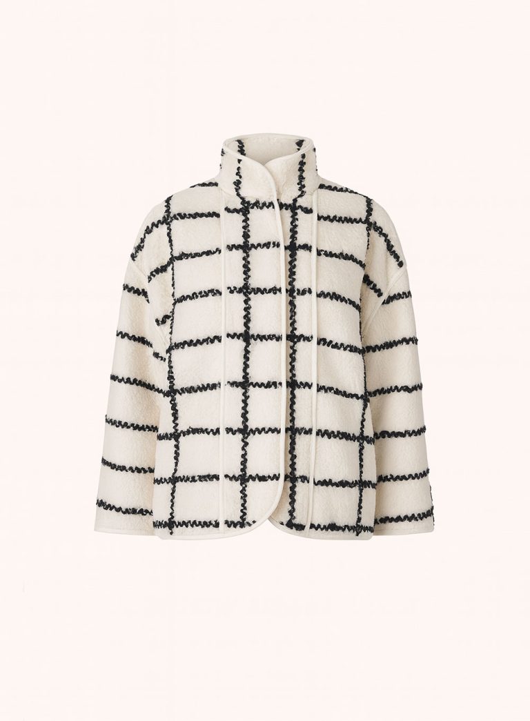 An ivory wool jacket featuring a sculptural silhouette and tactile grid embroidery in contrasting black. The curved hem and clean edges create a polished yet cozy statement piece — a balance of warmth and sophistication for modern winter layering.
