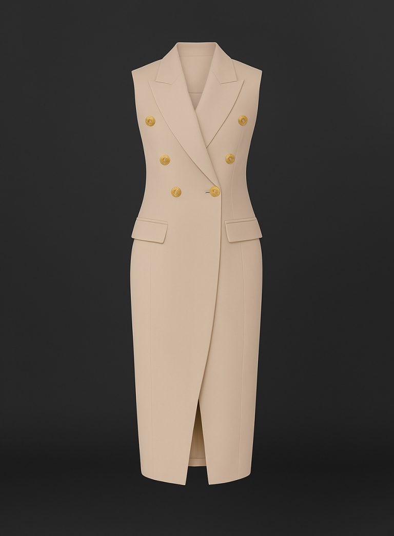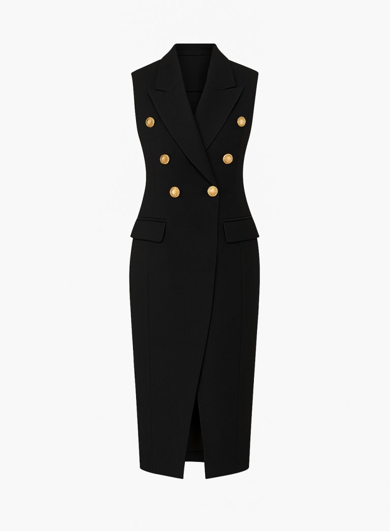 An elegant sleeveless midi dress that merges precision tailoring with timeless grace. The double-breasted front and sharp lapels evoke modern power dressing, while the structured silhouette ensures effortless sophistication. Ideal for both professional and evening settings, it embodies refined minimalism with a confident edge.