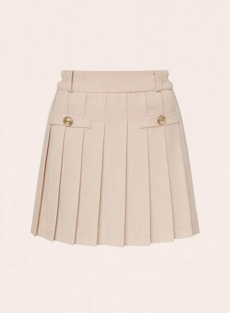 Defined by precise pleating and refined tailoring, this mini skirt reimagines classic uniform codes with a contemporary edge. The embossed metallic buttons and structured waistband introduce a subtle statement of sophistication. A versatile piece that transitions effortlessly from day to evening, pairing seamlessly with tailored tops or blazers.