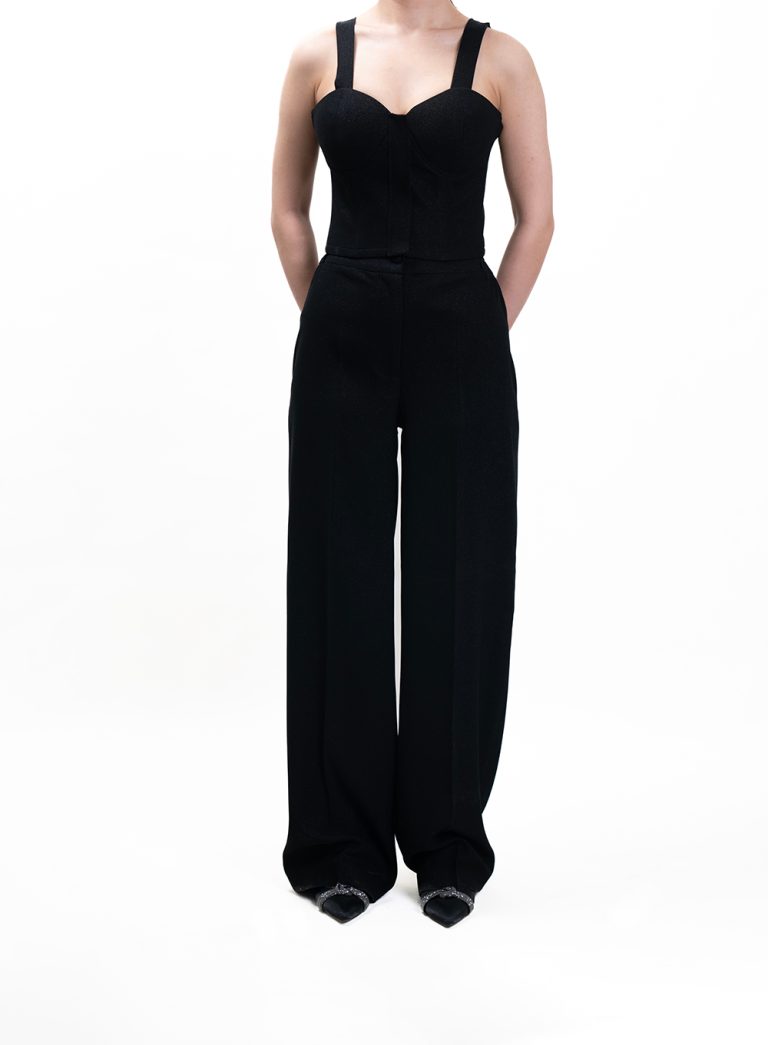 A sleek, form-fitted corset top designed with precision tailoring and structured cups. The wide straps and clean lines create a balanced silhouette, merging elegance with subtle strength. Perfect for both elevated evening looks and confident daywear pairings.