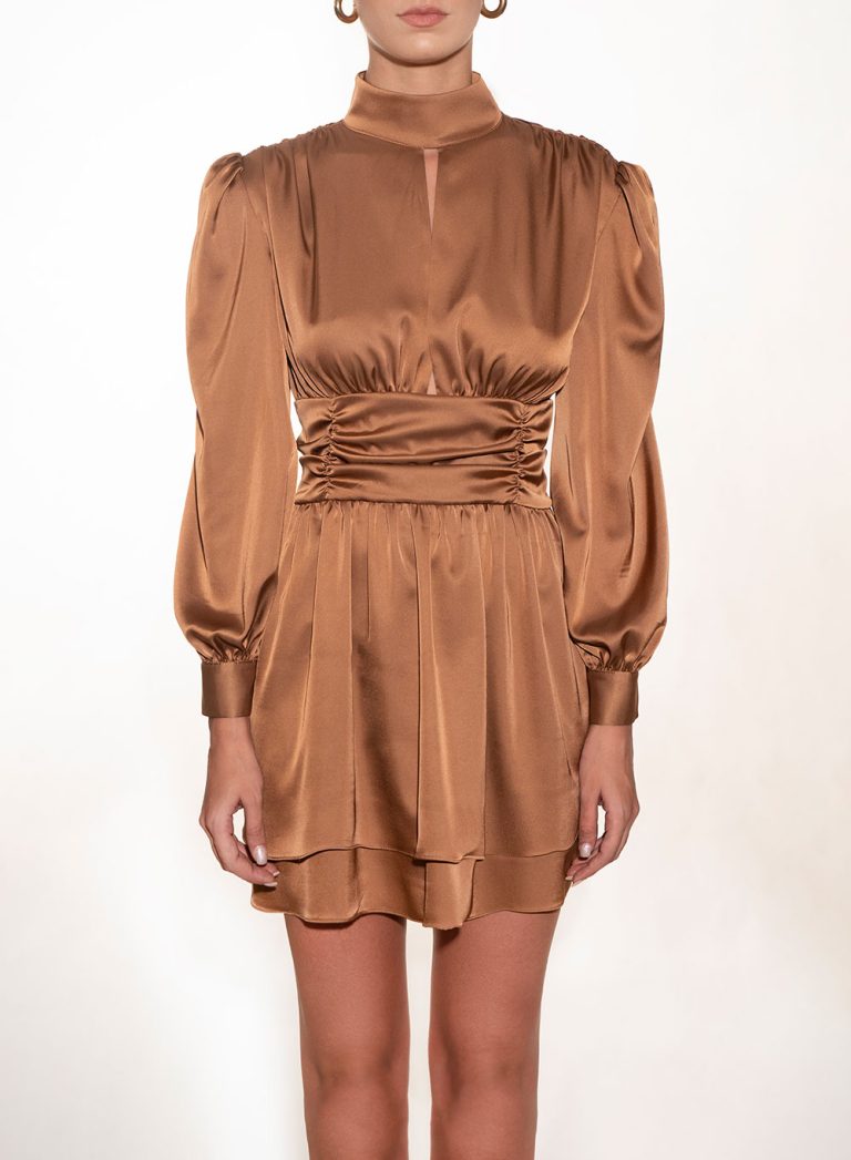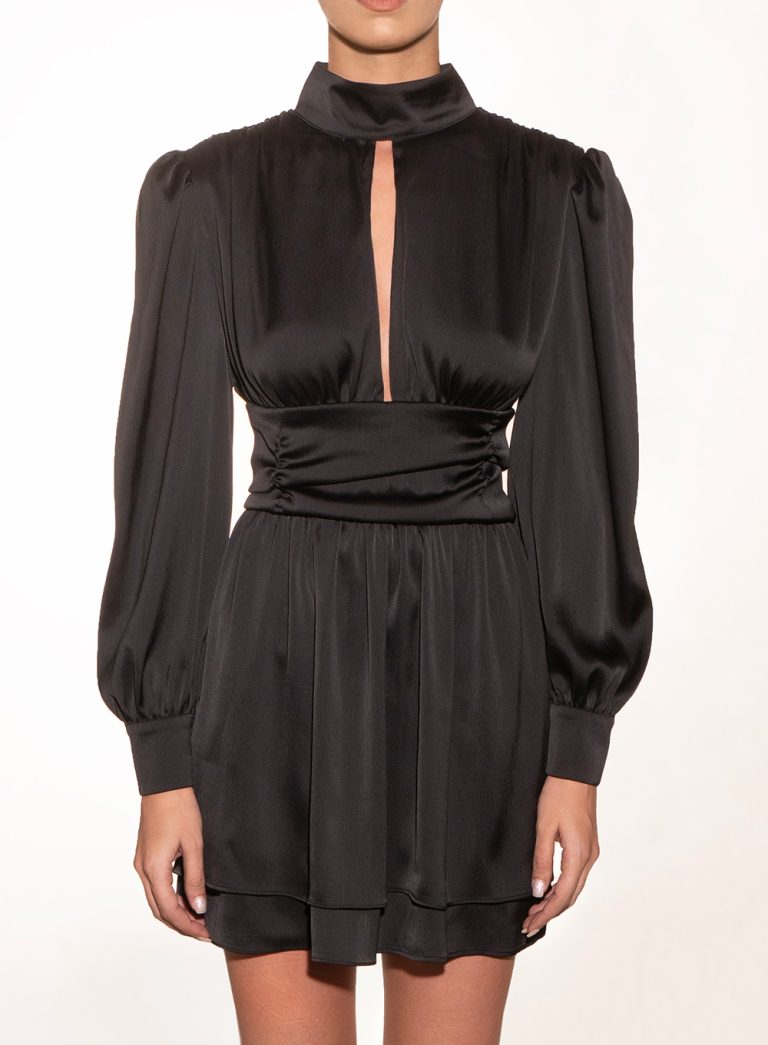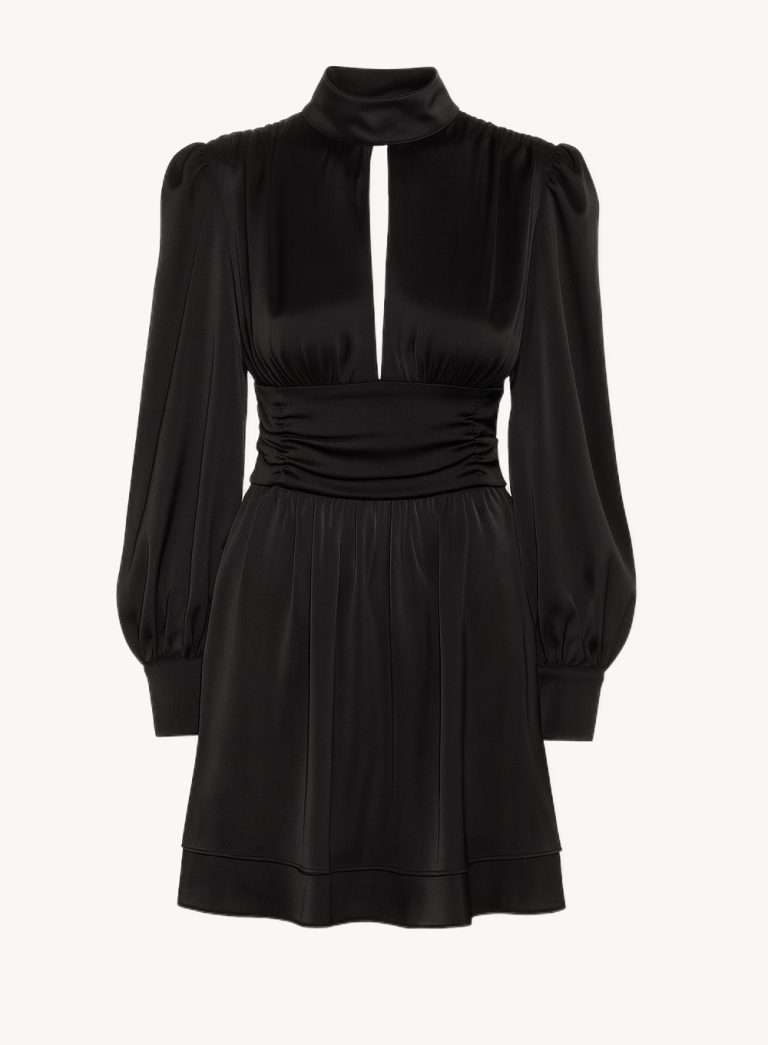 A luxurious mini dress defined by its draped waistline and structured shoulders. The high neckline and ruched detailing create an hourglass silhouette that balances elegance with confidence. Crafted from fluid satin, it captures movement and light with effortless sophistication — perfect for refined evening statements.