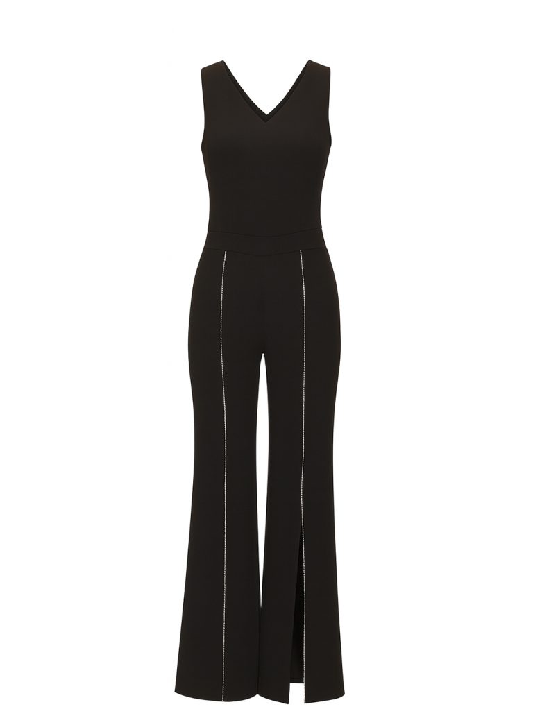 A sleek black jumpsuit designed with a clean V-neckline, sculpted waist, and elongated flared legs. Finished with refined contrast stitching and front slits, it creates an elegant, lengthened silhouette with modern minimalism.
