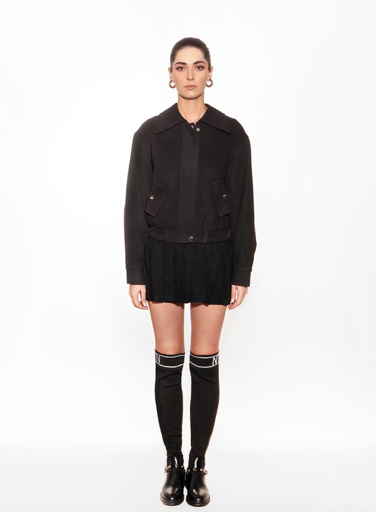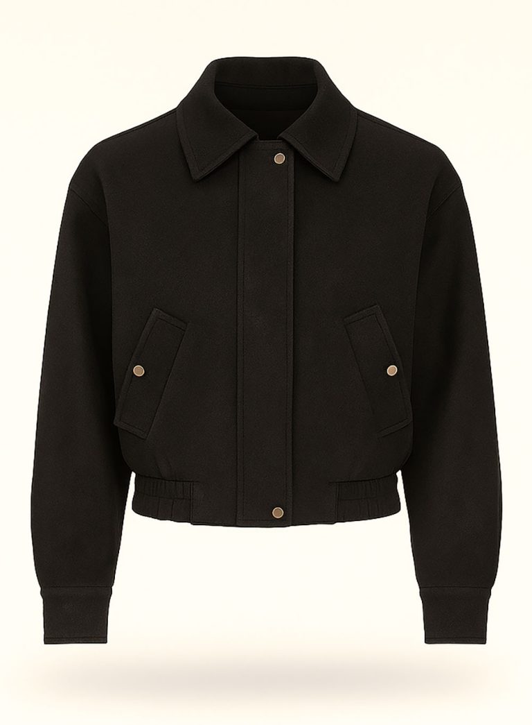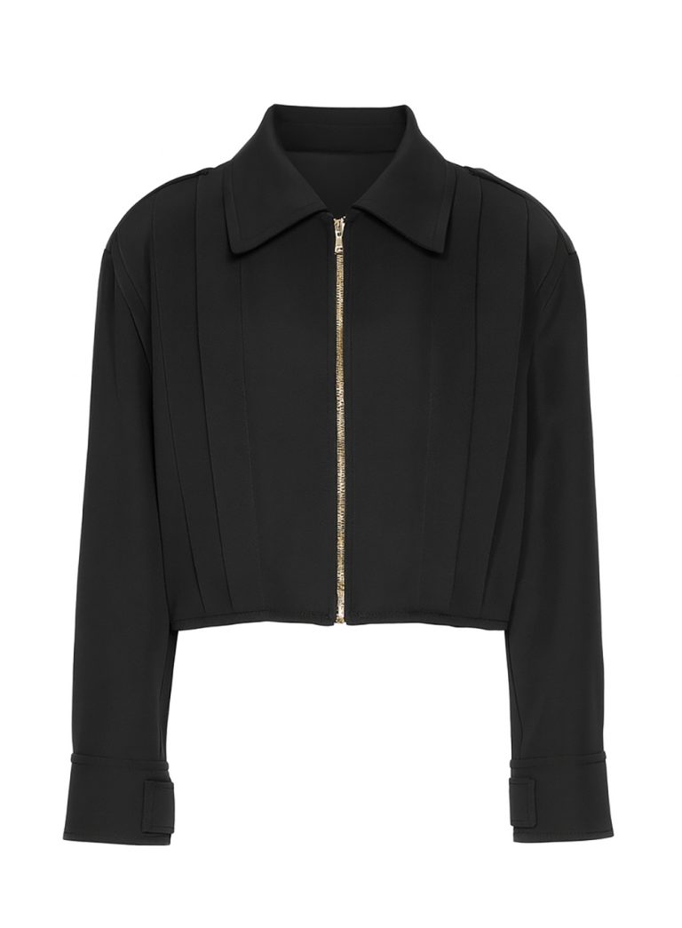 A sleek cropped jacket crafted with clean architectural paneling and a structured silhouette. Finished with a refined gold-tone zipper and tailored cuffs, it delivers a polished, modern minimalism ideal for both day and night styling.