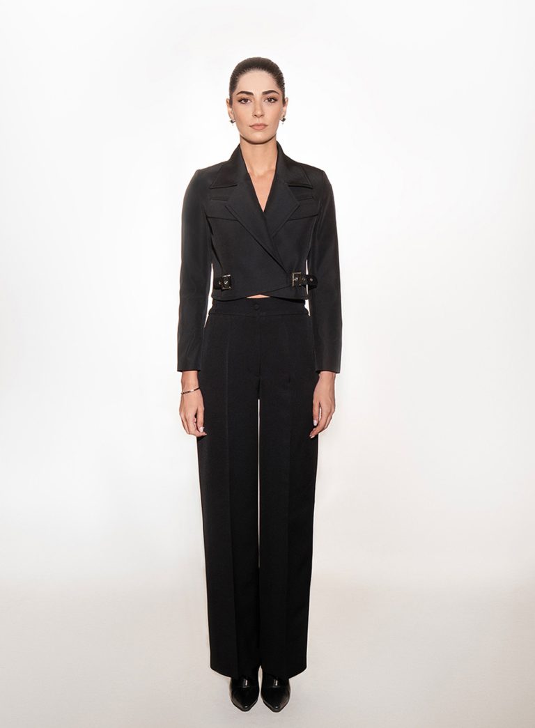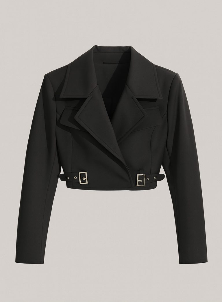 A refined reinterpretation of classic tailoring. This cropped blazer features structured shoulders, a double lapel design, and sleek buckle details at the waist for a sculpted silhouette. Crafted from smooth suiting fabric, it embodies modern sophistication—perfect for pairing with high-waist trousers or a minimalist bralette underneath.