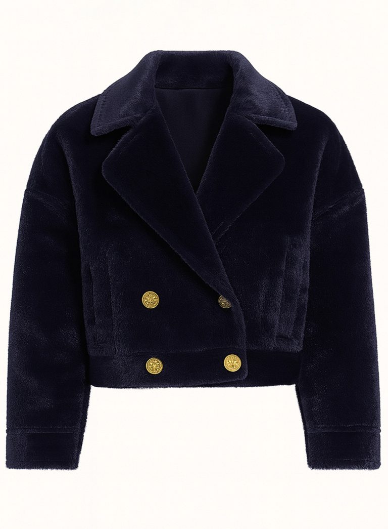 A luxurious and modern take on a classic silhouette. Crafted from an incredibly soft, plush faux fur material, this deep navy, cropped jacket features a sophisticated double-breasted front and wide notch lapels. It is flawlessly finished with signature gold-toned buttons, blending cozy texture with military-inspired chic.