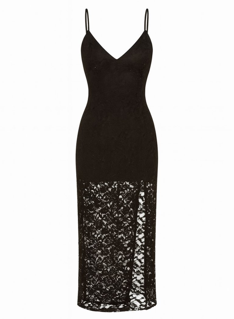 A refined lace slip dress featuring delicate straps, a sculpted bodice, and a semi-sheer skirt with a high front slit. Its floral lace overlay creates an elegant interplay of texture and transparency, offering timeless sophistication with a modern, confident allure.