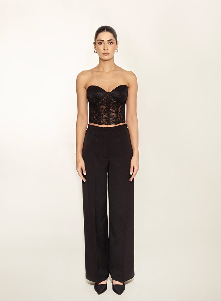 An alluring expression of modern femininity. This strapless lace bustier top features structured boning for a sculpted fit and delicate floral lace that reveals subtle texture and light. Designed to contour the body with elegance and confidence, it pairs effortlessly with tailored trousers or high-waist skirts for refined.