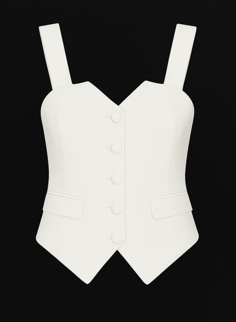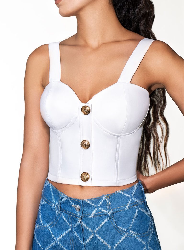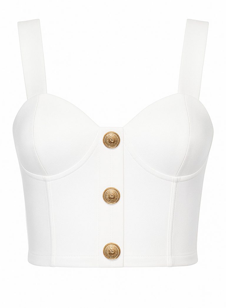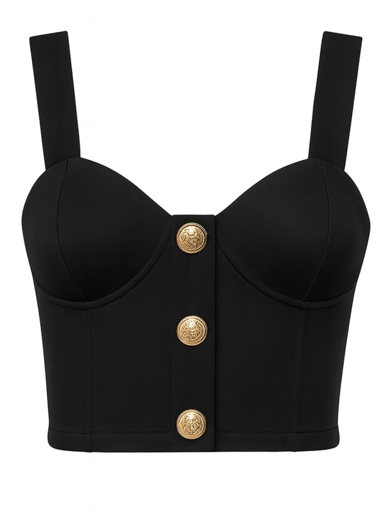 A structured bustier that redefines classic elegance through contemporary tailoring. Featuring contoured seams, wide straps, and statement metallic buttons along the front, it creates a bold yet refined silhouette. Designed to pair seamlessly with denim or tailored separates, this piece embodies confident minimalism and architectural precision.