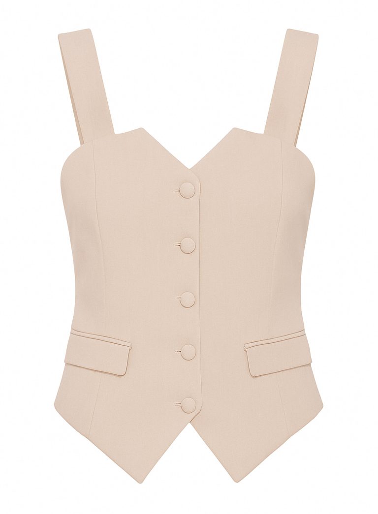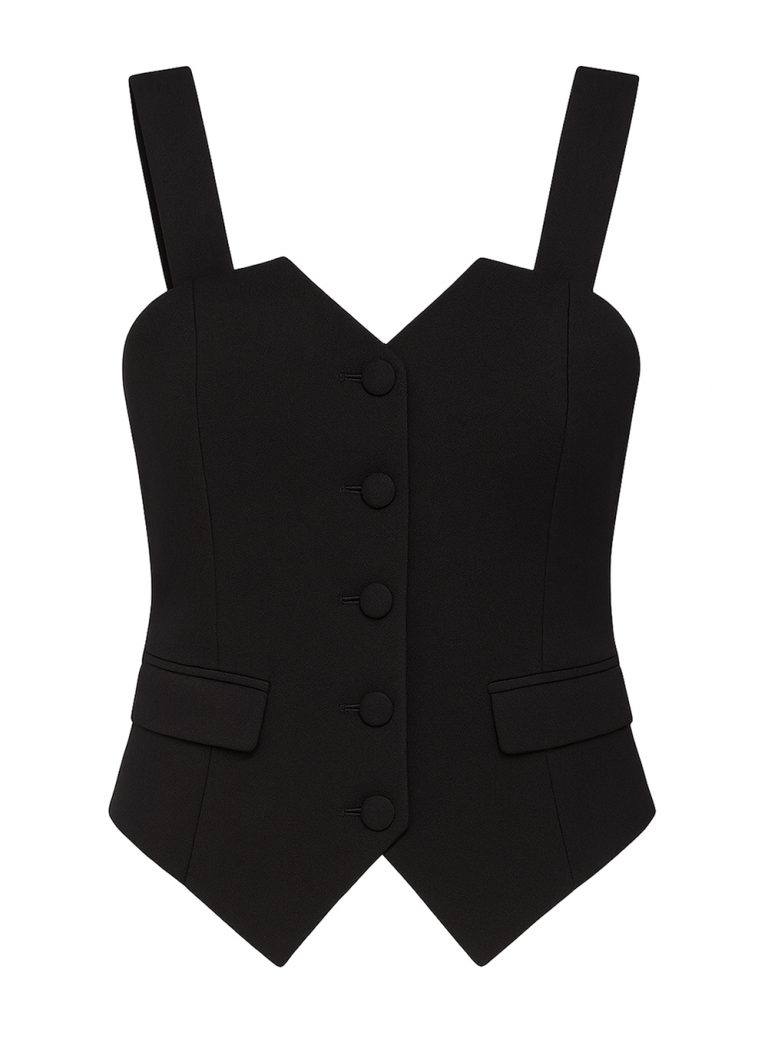 A precisely tailored corset top that blends architectural lines with feminine structure. Featuring sculpted seams and a contoured neckline, it enhances natural shape while maintaining refined minimalism. The wide straps and clean finish create a confident silhouette that transitions effortlessly from day layering to evening statement looks.