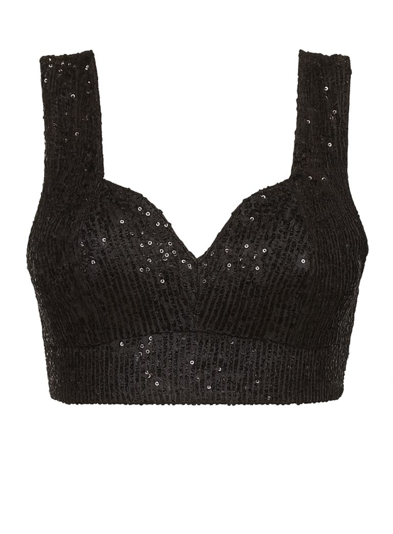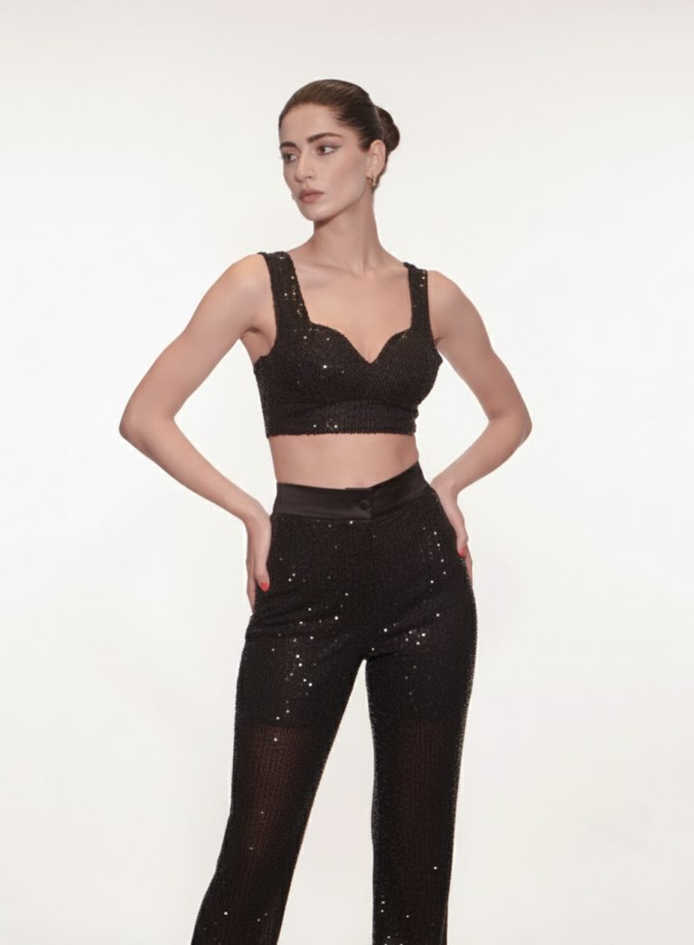 A statement cropped top designed to catch the light and elevate any evening look. Fully adorned with delicate sequins, it features a sculpted bust line and wide straps for a balanced blend of structure and sparkle. Perfect for pairing with high-waisted trousers or a sleek skirt for a modern, confident silhouette.