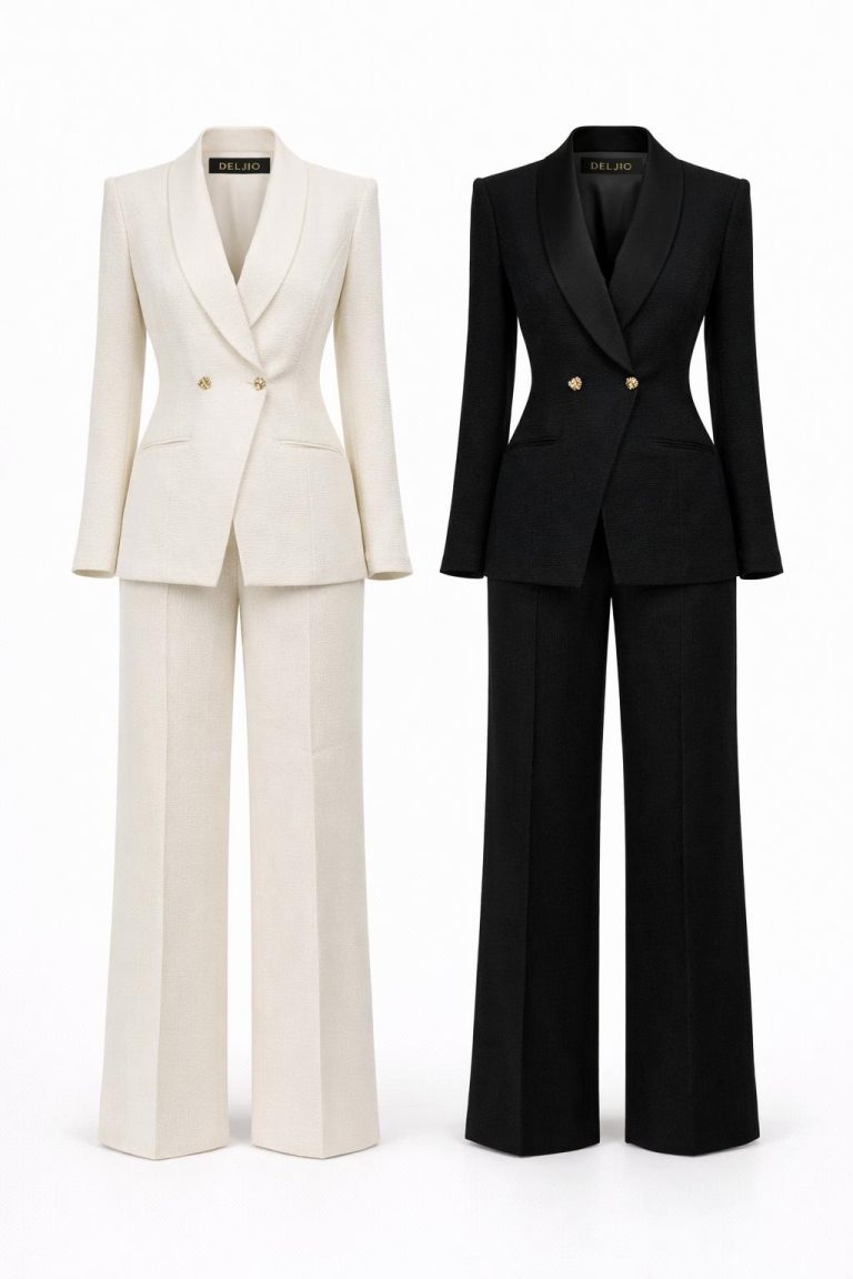 Paired with fluid wide-leg trousers, the full look creates an elongated, polished profile — elegant, confident, and timeless.