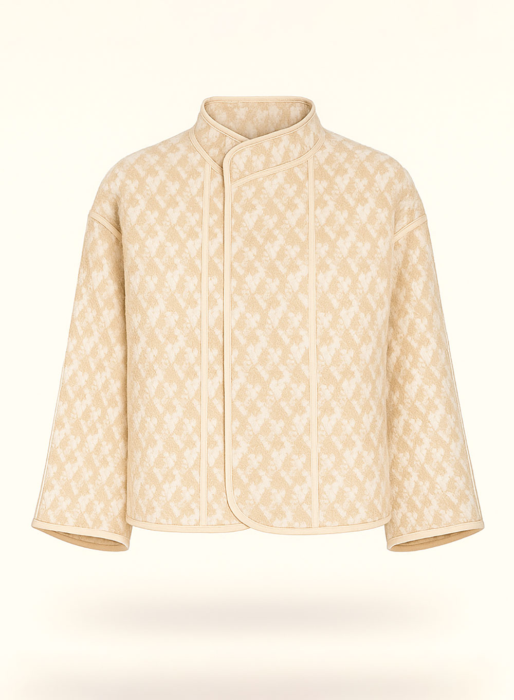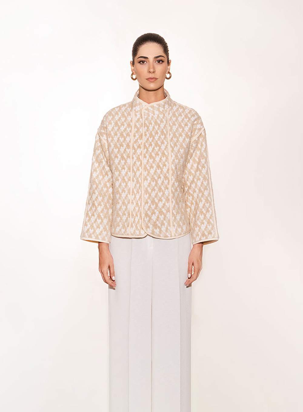 A sculptural expression of balance and form. This jacquard jacket features an architectural silhouette with clean lines, rounded hems, and softly structured shoulders. Designed to convey understated elegance, it pairs seamlessly with wide-leg trousers or tailored skirts, embodying quiet confidence and refined simplicity.