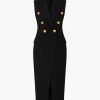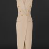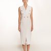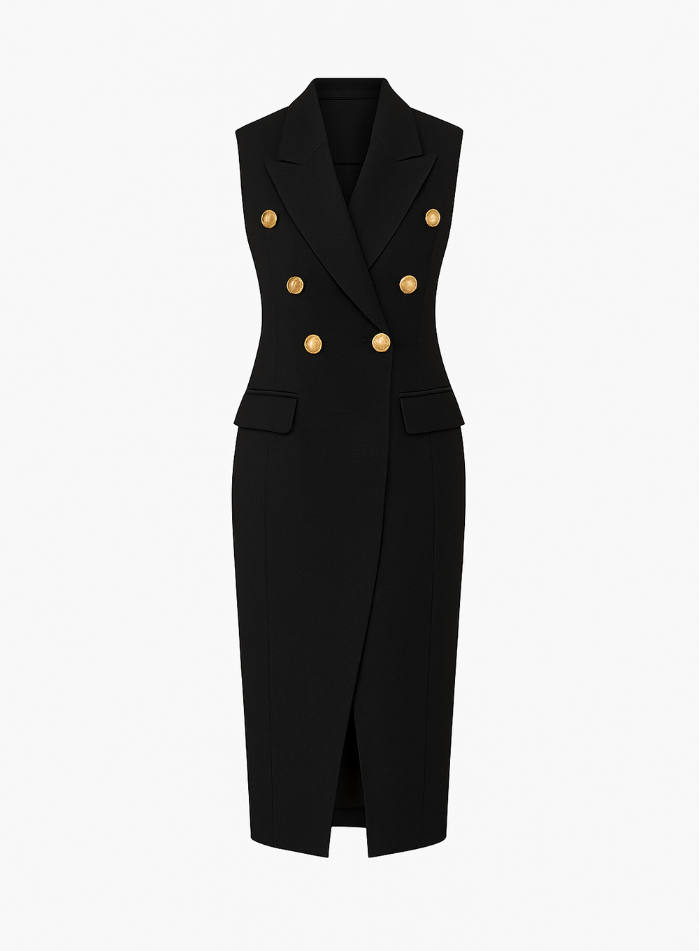 An elegant sleeveless midi dress that merges precision tailoring with timeless grace. The double-breasted front and sharp lapels evoke modern power dressing, while the structured silhouette ensures effortless sophistication. Ideal for both professional and evening settings, it embodies refined minimalism with a confident edge.