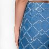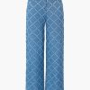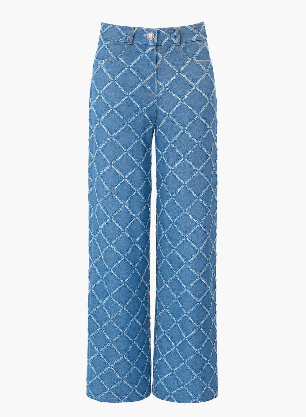 Crafted from structured blue denim with a diamond-textured weave, these high-rise trousers redefine casual sophistication. The geometric stitching adds sculptural depth, while the straight-leg silhouette elongates the figure. Perfectly paired with crisp white tops or cropped bustiers for a refined contrast.