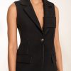 A sculpted take on classic tailoring. This sleeveless blazer is crafted from smooth, structured fabric with sharp lapels, a single-button closure, and flap pockets that define its minimalist elegance. The contoured seams enhance the silhouette, creating a refined balance between power and femininity. Perfect for layering over wide-leg trousers or wearing solo for an elevated evening statement.
