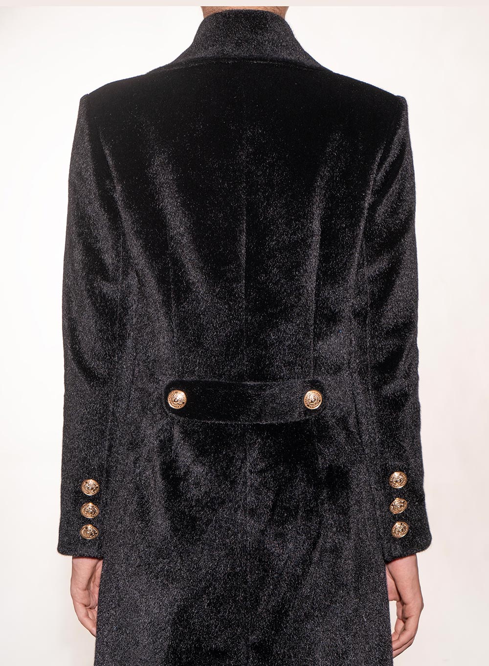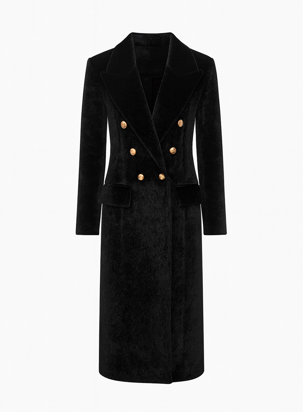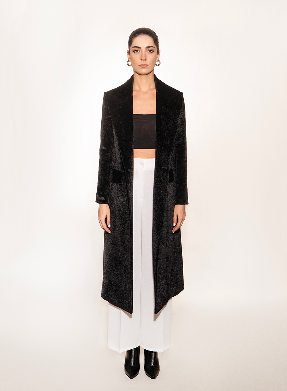 A refined long coat with a minimalist silhouette and structured shoulders, designed to enhance a clean, confident look. The sleek tailoring and double-button detail bring balance between classic sophistication and modern precision — ideal for transitional seasons and timeless wardrobes.