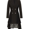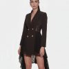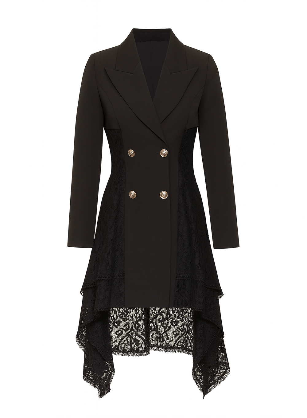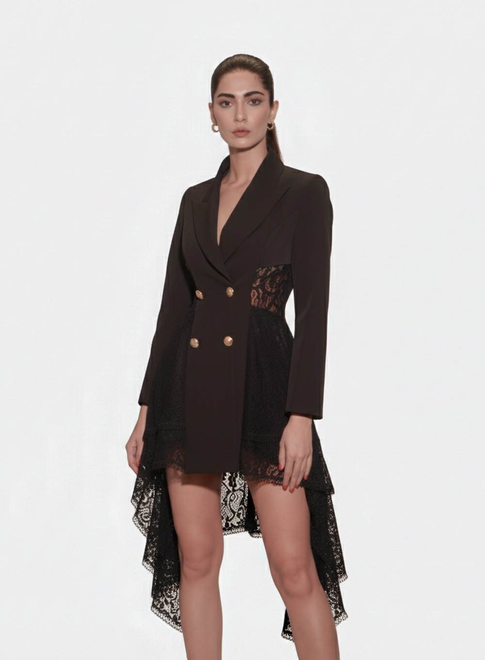 A refined blazer dress elevated with romantic lace. This double-breasted design features sharp tailored lapels, sculpted waist panels, and a dramatic handkerchief lace hem for a sophisticated silhouette that blends power and femininity. Finished with gold-tone buttons for a polished touch.