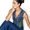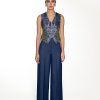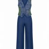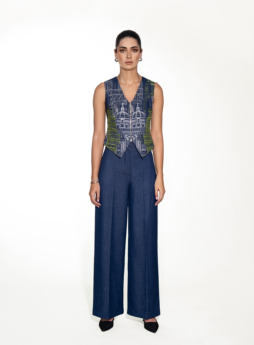 A tailored sleeveless denim top featuring intricate architectural embroidery, paired with wide-leg matching trousers. The structured silhouette and artistic detailing combine craftsmanship with modern design, creating a statement look that bridges elegance and individuality.