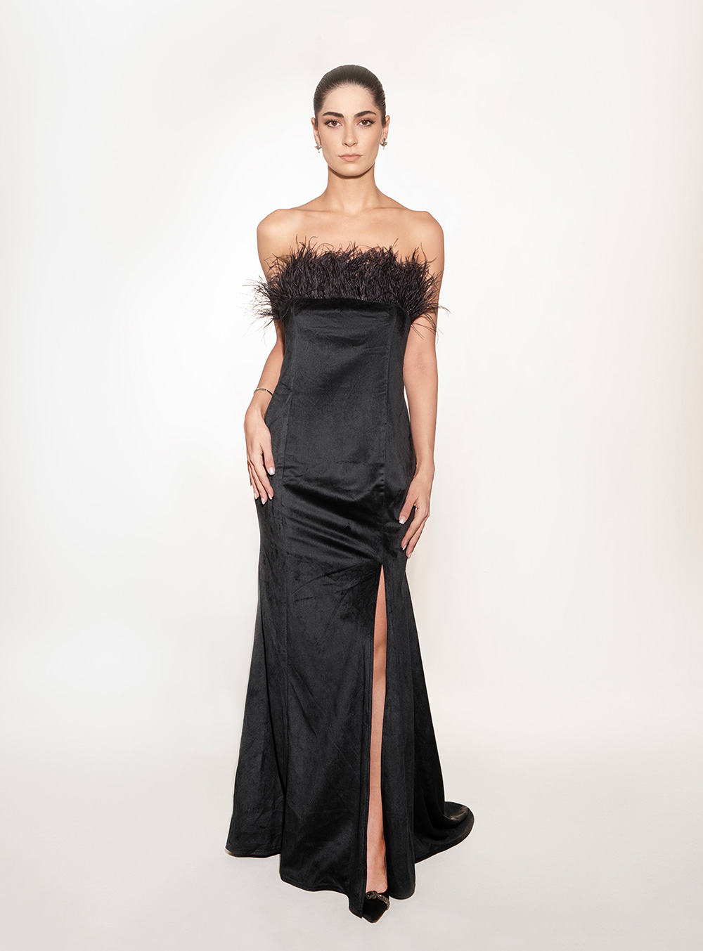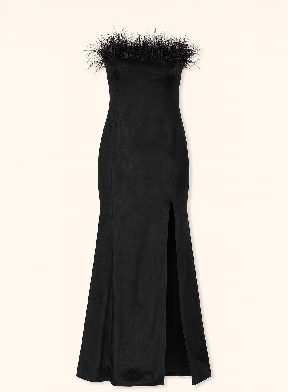 A luminous evening dress designed for magnetic presence. Featuring delicate straps, a fluid silhouette, and a high side slit, it captures the perfect balance between sophistication and allure. The fully sequined surface catches light with every movement, creating an effortless yet striking statement for night occasions and special events.