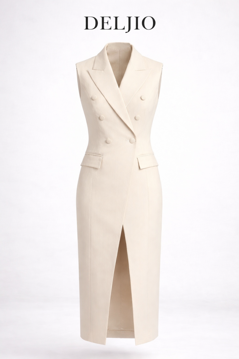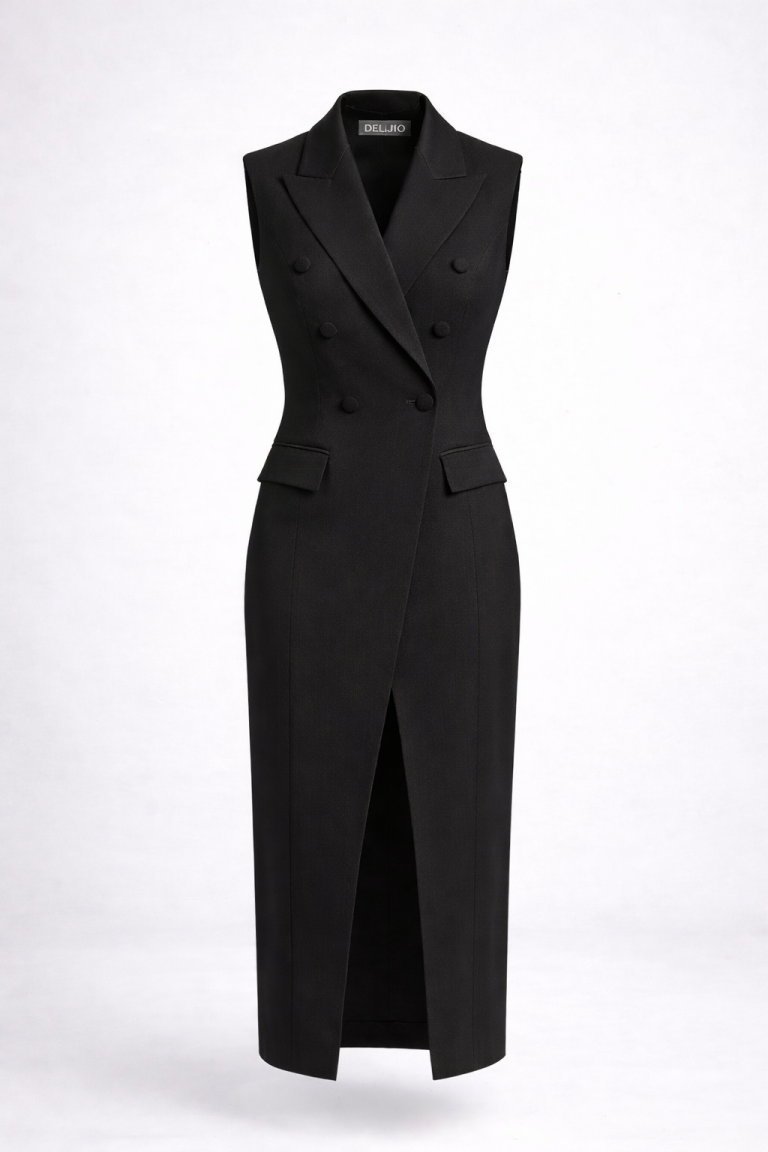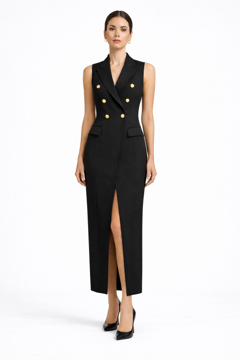 An elegant sleeveless midi dress that merges precision tailoring with timeless grace. The double-breasted front and sharp lapels evoke modern power dressing, while the structured silhouette ensures effortless sophistication. Ideal for both professional and evening settings, it embodies refined minimalism with a confident edge.