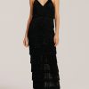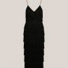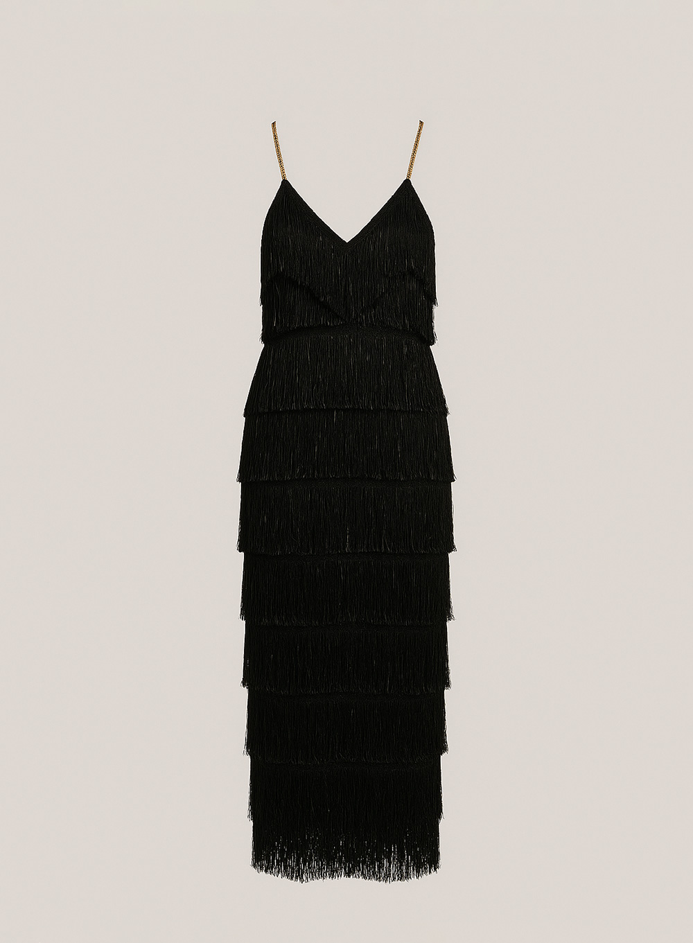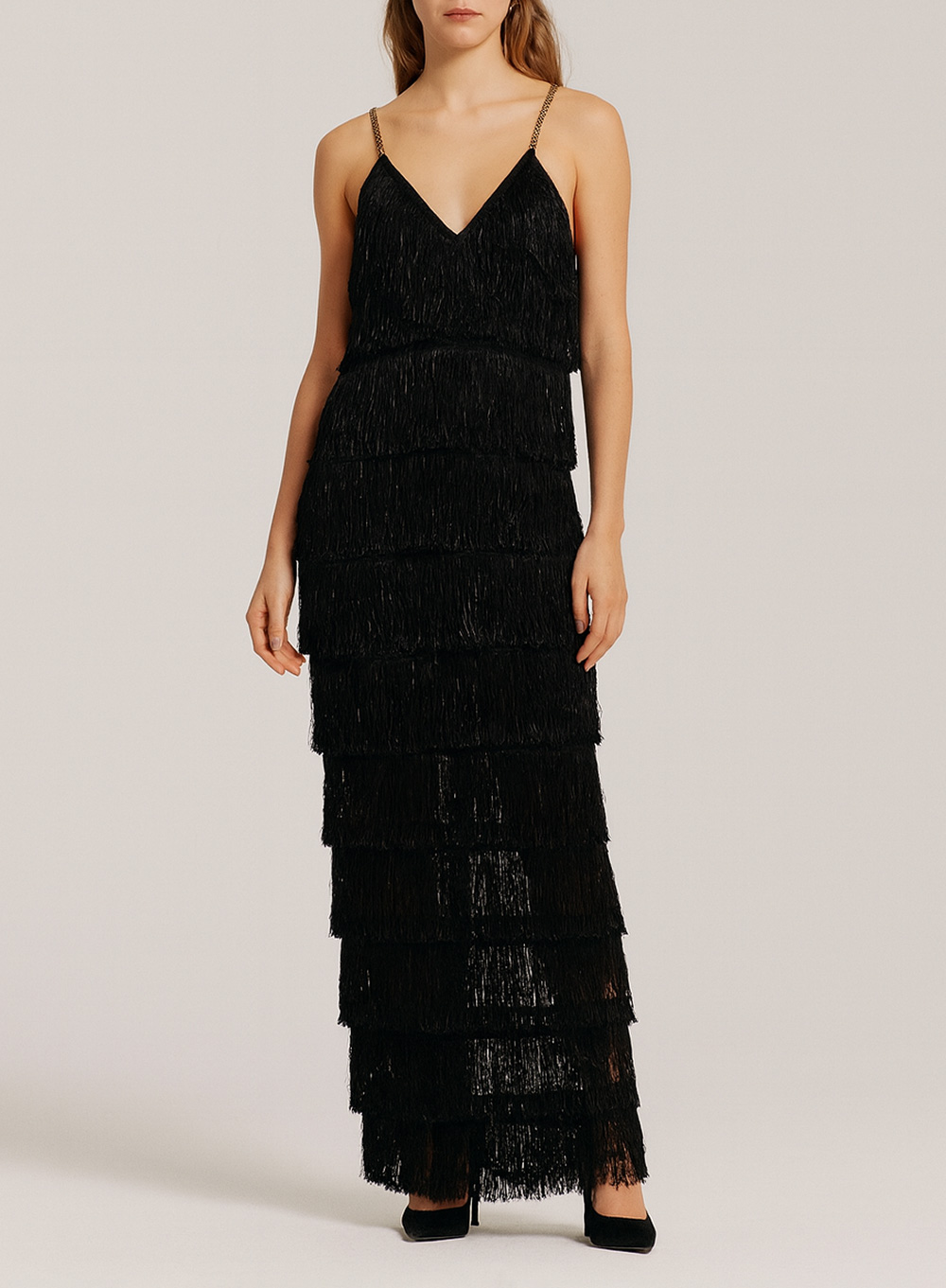 A flowing maxi dress designed with cascading fringe tiers and delicate chain straps, creating an elegant, movement-filled silhouette perfect for evening occasions.