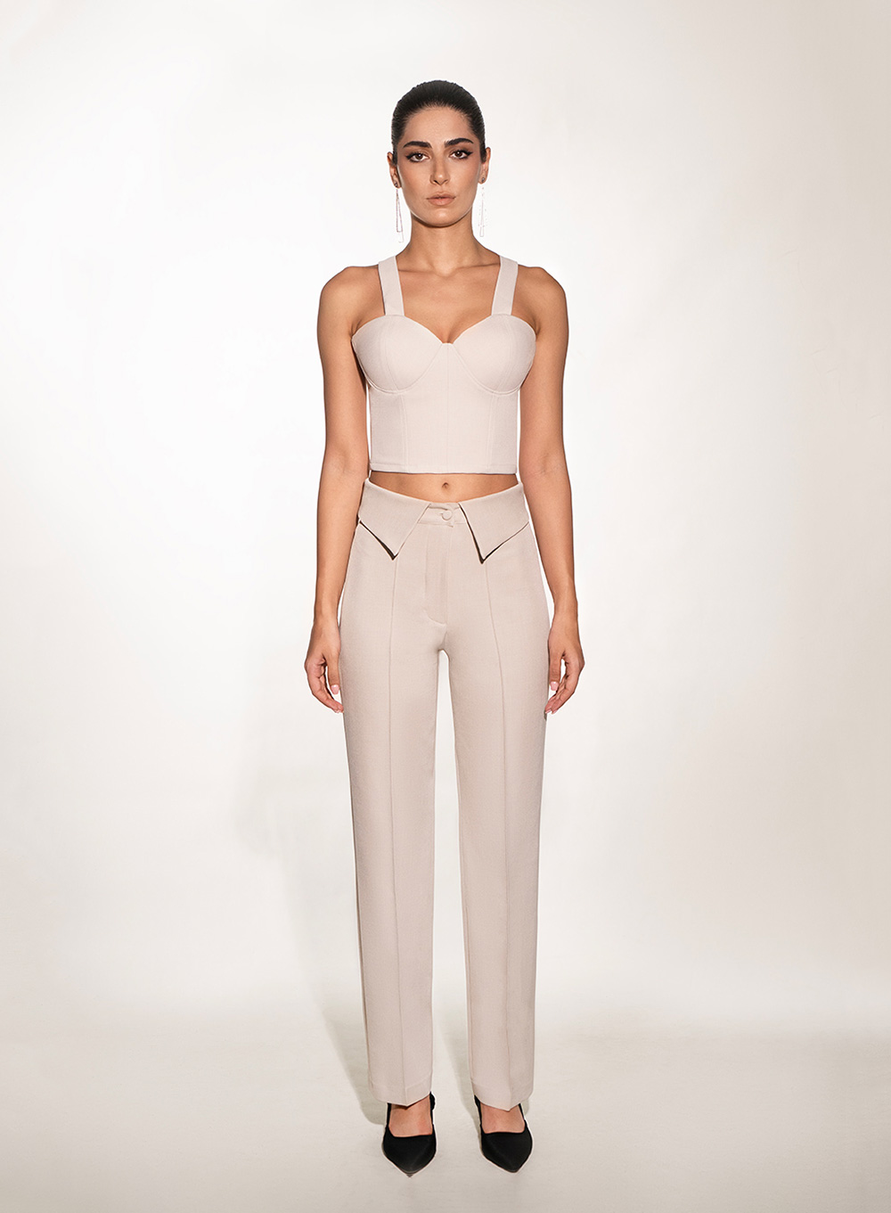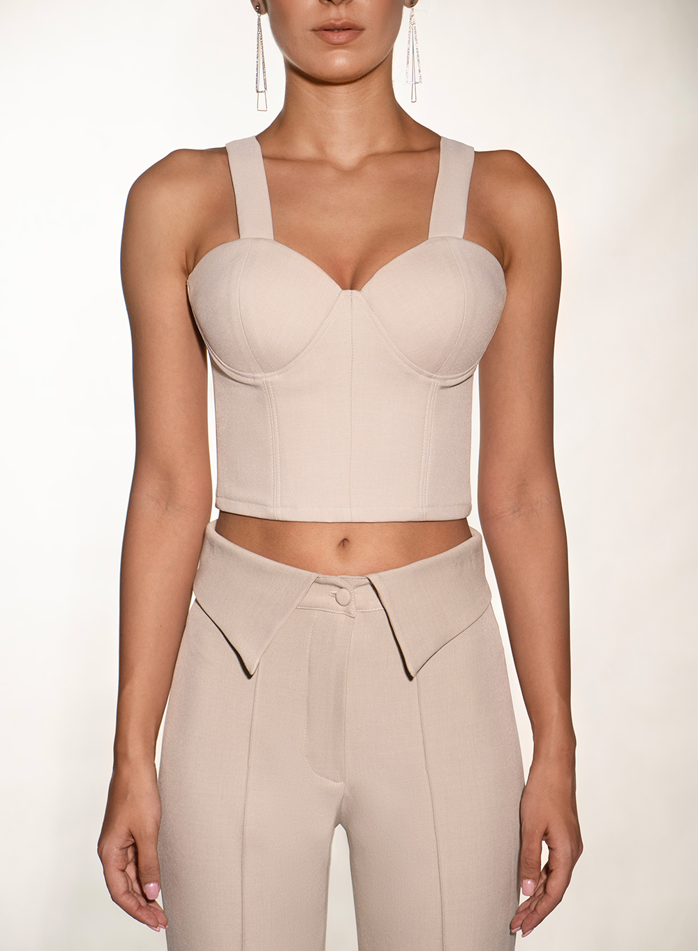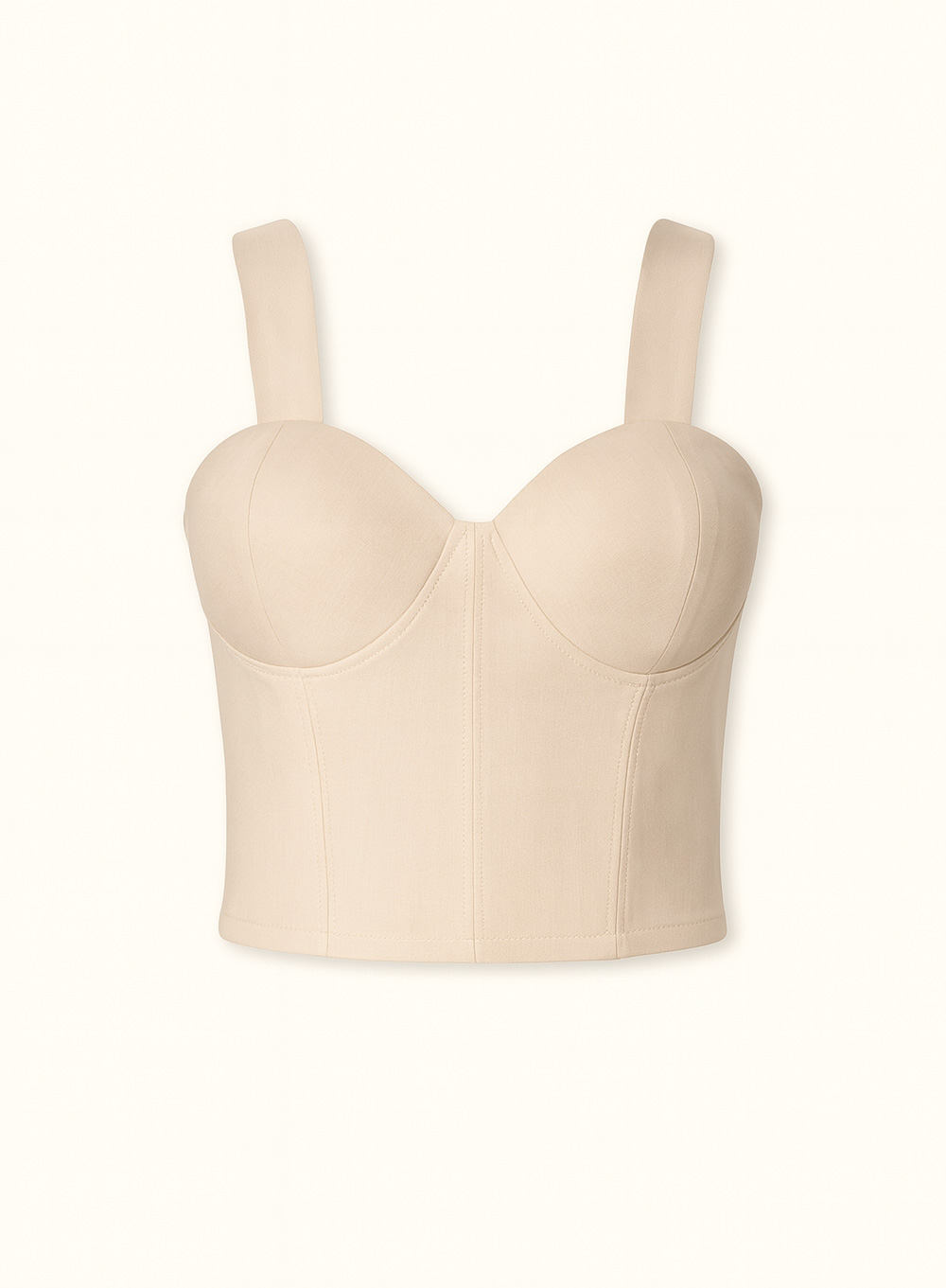 A precisely tailored corset top that blends architectural lines with feminine structure. Featuring sculpted seams and a contoured neckline, it enhances natural shape while maintaining refined minimalism. The wide straps and clean finish create a confident silhouette that transitions effortlessly from day layering to evening statement looks.