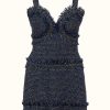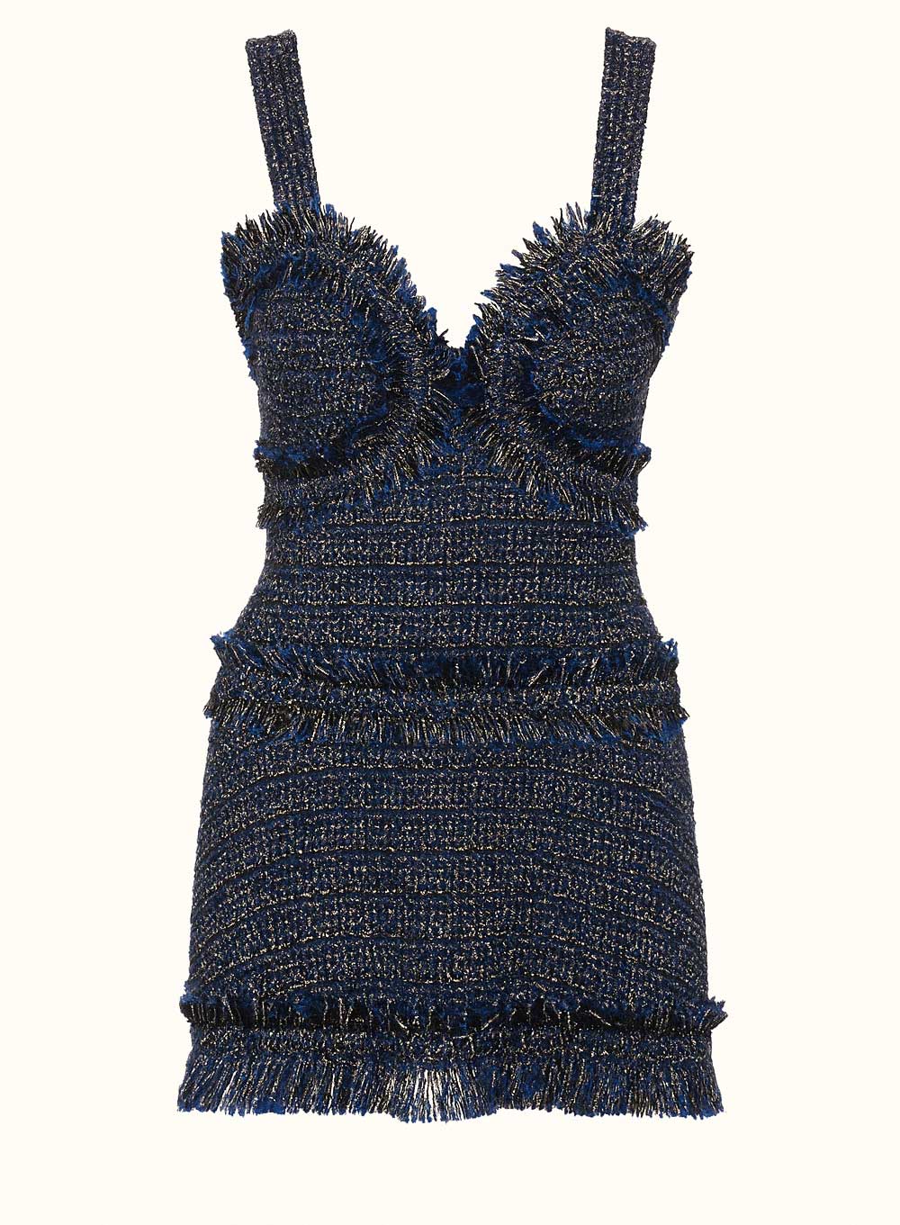 A sculpted tweed mini dress with intricate fringed detailing and a figure-flattering silhouette. The textured weave and bold craftsmanship create a striking interplay of structure and movement — an expressive, statement piece for elevated evening style.