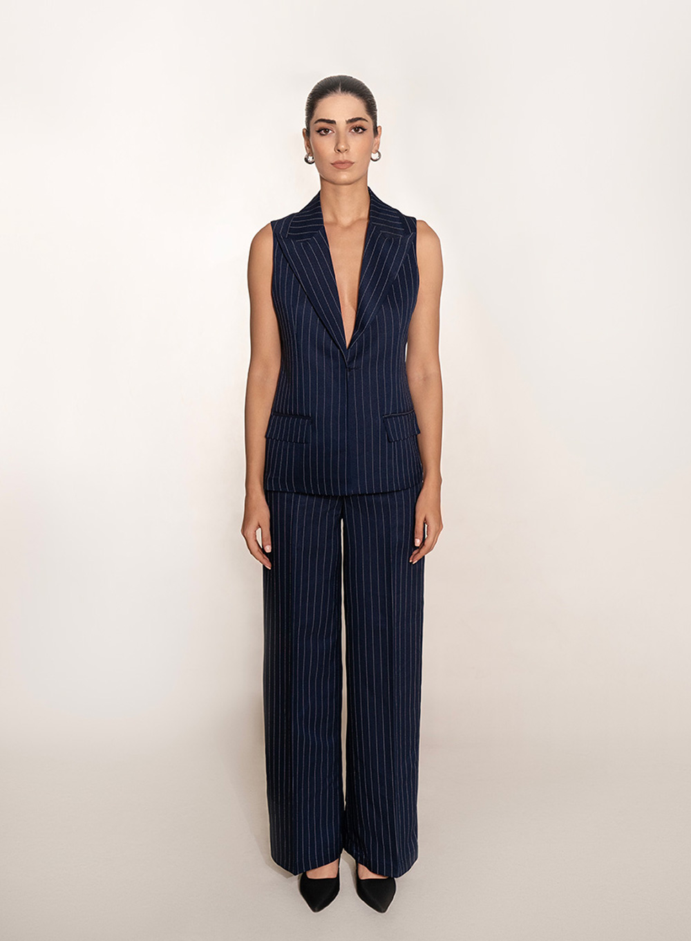 A reimagined classic that merges menswear precision with feminine minimalism. This sleeveless vest features sharp tailoring, structured shoulders, and elongated lines that sculpt the silhouette. Designed for versatility, it can be worn solo as a statement piece or layered over shirts and dresses for an elevated, contemporary edge.