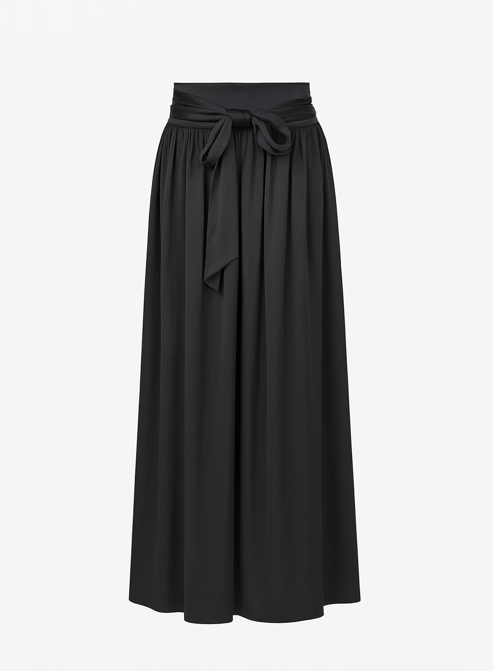 A timeless expression of effortless elegance. Crafted from a luxurious, fluid fabric that provides a beautiful, soft drape and gentle movement. The high-waisted silhouette is impeccably styled with a chic self-tie sash, making this black maxi skirt a versatile foundation for a refined, elevated look.