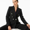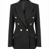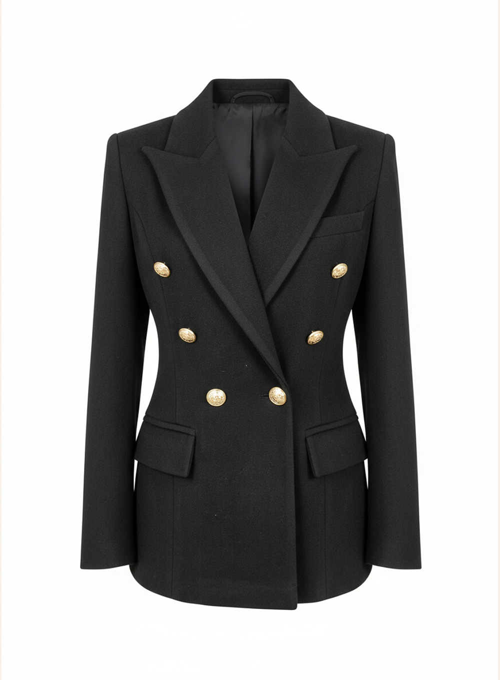 Embody power and precision with this iconic double-breasted blazer. Impeccably tailored to create a sharp, cinched silhouette, this black jacket features bold peak lapels and is distinguished by four signature gold-toned buttons. Crafted from a luxurious wool blend, it’s the ultimate statement of timeless, military-inspired elegance.