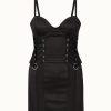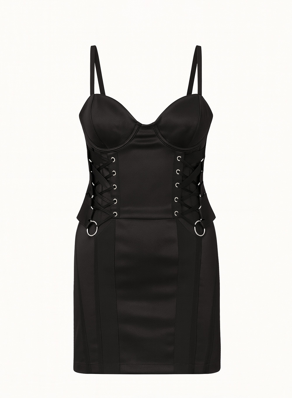 Embrace an assertive elegance with this sophisticated black pencil dress. Crafted from luxurious, high-shine satin, it features a figure-hugging sheath silhouette and a structured bustier bodice with a flattering sweetheart neckline. The waist is defined by intricate side corset lacing and sleek metal hardware, creating a commanding and glamorous evening look.